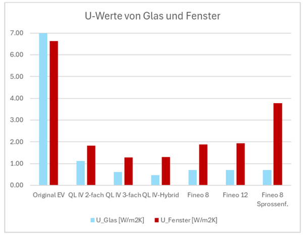 À partir d'un vantail aux proportions typiques des fenêtres historiques, M. Ganz a étudié plusieurs procédés permettant de conserver autant que possible la substance d'origine, tout en remplaçant le verre. Il a comparé les fenêtres doublées selon le procédé Quadra Ligna (double et triple vitrage), les fenêtres avec deux verres sous vide d'épaisseurs différentes et une version hybride combinant les deux.